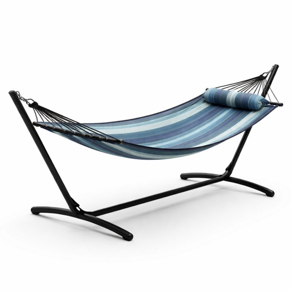 Striped Fabric Hammock with Steel Frame and Pillow Blue 260cm